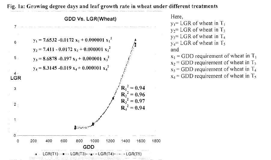 Abstract: Temperature is an important weather parameter affecting the growth and development of the crop. The growing degree days (GDD) indicate the thermal index required for the onset of phenophases in crop. A two-year (2008-09 and 2009-10) field experiment was conducted at the B.C.K.V Instructional Farm to investigate the effect of GDD on leaf growth rate (LGR), crop growth rate (CGR) and leaf area indices (LAI) of wheat and mustard grown under sole (T1 and T2) and intercrop situations, [2 wheat:6 mustard (T3), 4 wheat:4 mustard (T4) and 6 wheat:2 mustard (T5)]. The experiment was laid out in a RBD design with 6 replications having a plot size of 50 m2. The experimental soil has pH of 6.92, organic carbon 0.63%, total N 0.06%, available P2O5 18.47 kg/ha and available K2O 127.22 kg/ha. The experimental site is under tropical humid climate. From the results, leaf growth rate, crop growth rate and leaf area index were found to be polynomial function of GDD. The results also suggested that the effect of GDD on different growth indices of wheat and mustard were strongly expressed in 4 wheat:4 mustard row ratios which might be adopted in the Gangetic Plains of New Alluvial zone of West Bengal.