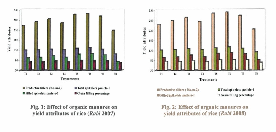 Abstract: A field experiment was conducted to study the effect of organic sources of nutrients (enriched FYM compost, vermicompost, FYM+neem cake, enriched FYM compost+vermicompost+FYM, composted poultry manure and enriched poultry manure compost) and recommended NPK fertilizer on rice. The results revealed that the application of enriched poultry manure compost on equal N basis (2.3 t ha-1) recorded higher yield attributes and grain yield of 4675 kg ha-1 in 2007 and 4953 kg ha-1 in 2008, which was however comparable with composted poultry manure and better than other organic manure treatments and also inorganic source treatment The lower grain yield obtained with absolute control which did not receive organic manures and recommended NPK addition.