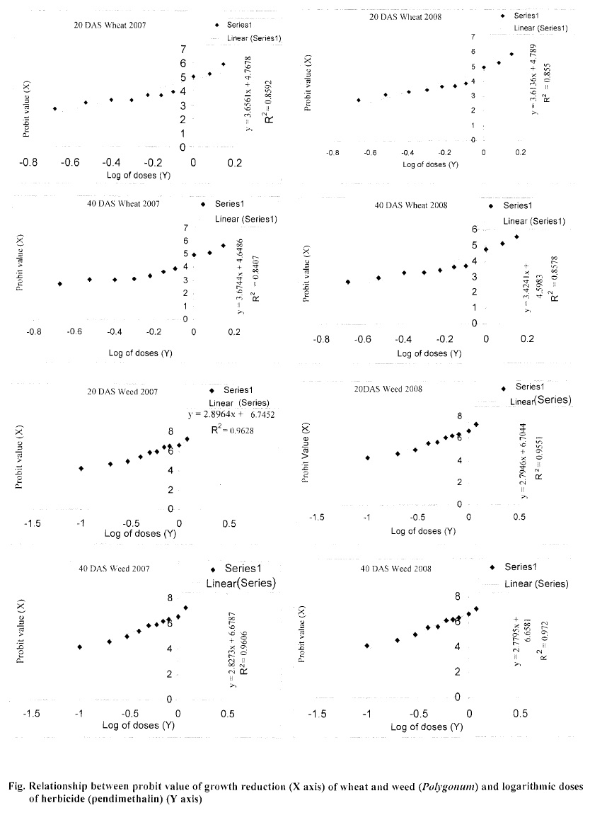 Abstract: A field experiment was carried out during the rabi season of 2007 and 2008 in Cooch Behar, West Bengal, India, involving application of pendimethalin at 0.00, 0.20, 0.30, 0.40, 0.50, 0.60, 0.70, 0.80, 1.00, 1.20 and 1.40 kg/ha to wheat and at 0.00, 0.10, 0.20, 0.30, 0.40, 0.50, 0.60, 0.70, 0.80, 1.10 and 1.20 kg/ha to weeds (Polygonumspp. including P. persicaria [Persicaria maculosa], P. pensylvanicum [Persicaria pensylvanica], P. orientale [Persicaria orientalis] and P. odoratum). The phytotoxic effect to the wheat plant was manifested with characteristic yellowing and necrotic symptom, which appeared within 8-10 days after sowing (DAS) in newly emerged seedlings. This was followed by death of seedlings within 12-15 DAS. The selectivity index (SI) value of pendimethalin for wheat-Polygonum association was 1.06 and 1.03 at 20 DAS during 2007 and 2008, respectively, in which the GR10 (dose that caused 10% growth reduction) values of wheat were 0.516 and 0.505 kg/ha and the GR80(dose that caused 80% growth reduction) values of weeds were 0.488 and 0.491 kg/ha during 2007 and 2008, respectively. At 40 DAS, the SI values were 1.08 and 1.1, in which the GR10 values of wheat were 0.544 and 0.553 kg/ha and the GR80 values of weeds were 0.506 and 0.503 kg/ha during 2007 and 2008, respectively. Pendimethalin at 0.50 kg/ha could be effective to achieve >80% weed control efficacy in wheat without showing any phytotoxic effect to wheat under terai agro-ecological region of West Bengal and it could help the poor farmers to reap maximum benefit by saving their crop from severe crop-weed competition.