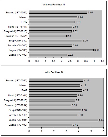 Fig 1: Comparative efficiency of rice genotypes in extracting N from soil pool (in terms of grain yield) with and without application of fertilizer N.