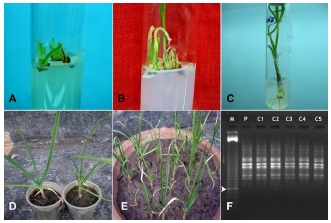 Fig: A- Bud induction, B- Shoot multiplication, C- Root induction and elongation, D- Primary acclimatization, E- Secondary acclimatization, F- Gel electrophoresis of amplified ISSR products of in vitro regenerated propagules (C1 – C5) and their mother (P) using IS-8 primer. Lane M- 50bp ladder.